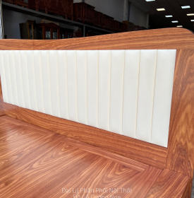 Phần đầu giường được làm cao bọc nệm da thêm sang trọng - hiện đại, tôn lên dáng vẻ sang trọng, uy thế của chiếc giường. Người dùng có thể tựa lưng khi ngồi đọc sách hoặc xem phim trong phòng ngủ. Đầu giường dạng trơn, mặt gỗ liền nguyên tấm giúp những vân gỗ mộc nổi lên đẹp nhất. Vạt nan cơ bản giúp lưu thông khí tốt và đảm bảo không gây bí bách.