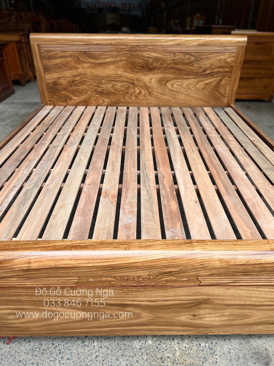 Đầu giường và đuôi giường được chạm khắc những hoa văn đơn giản, góp phần tạo nên sự tinh tế của mẫu giường ngủ gỗ hương xám tự nhiên.