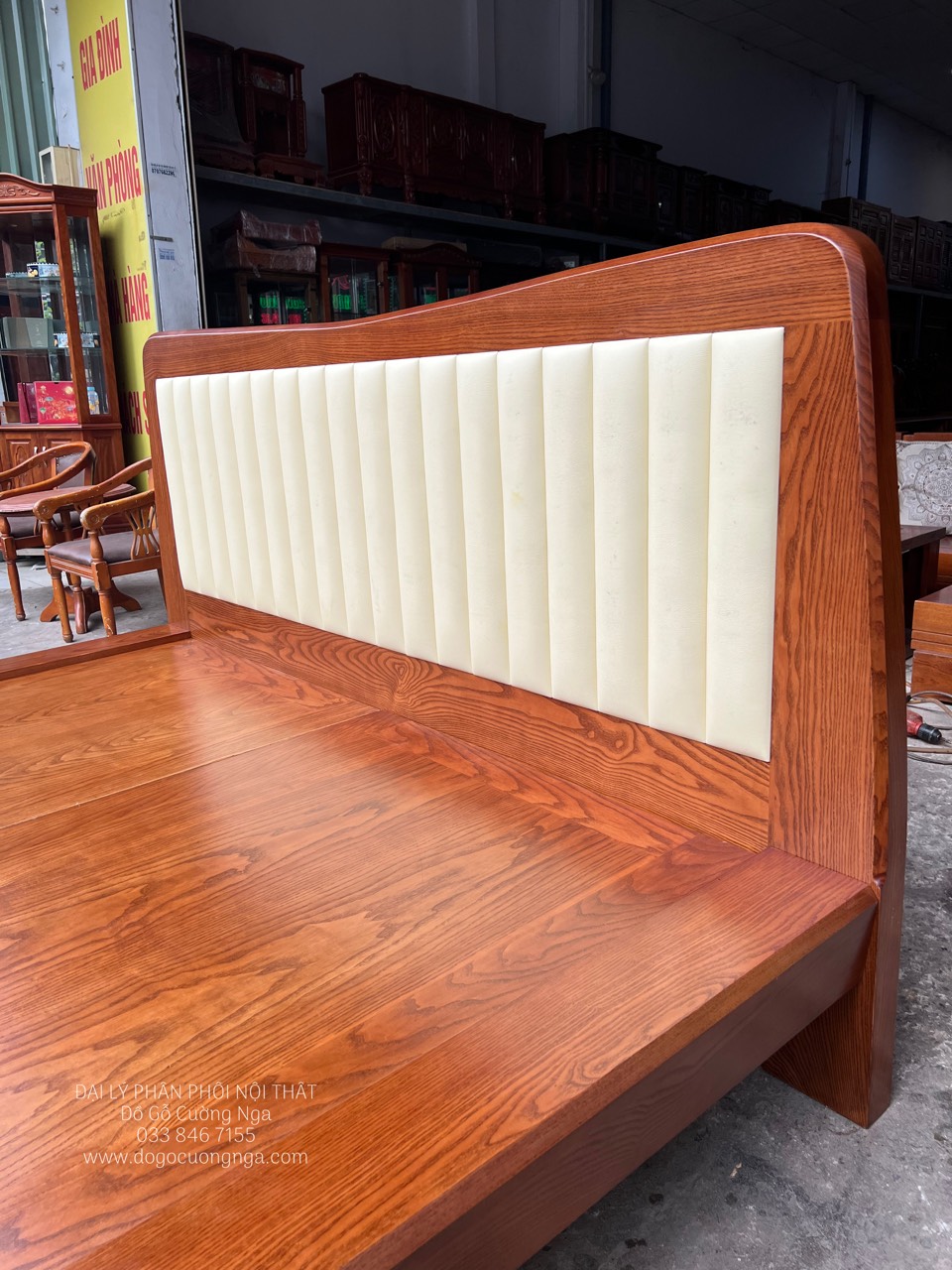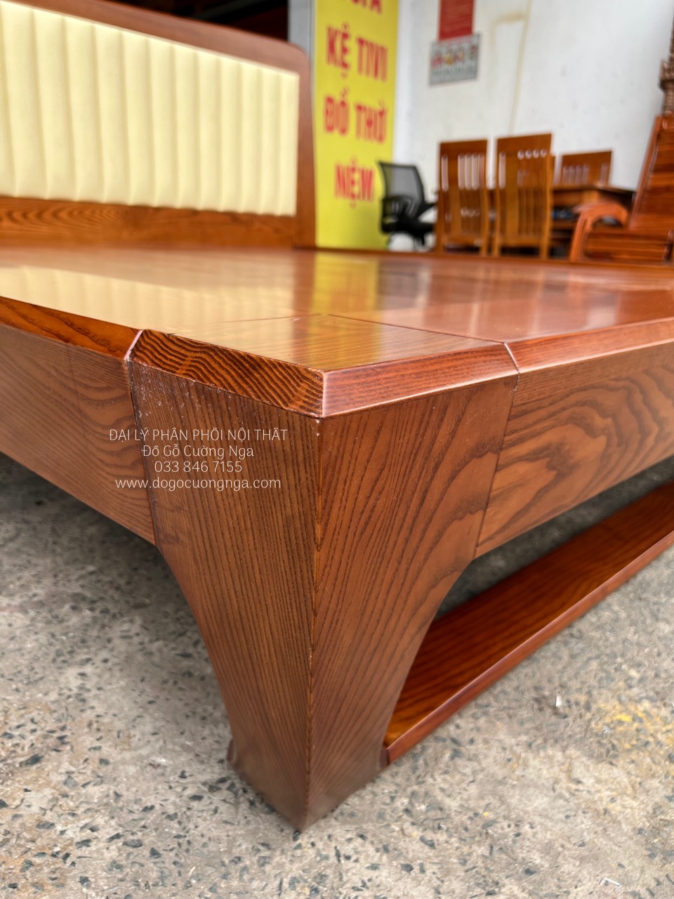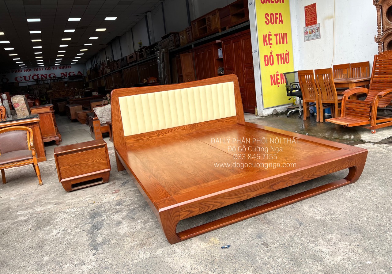 Giường gỗ lấy cảm hứng từ những đường cong mềm mại, cho ra một tác phẩm tuyệt vời. Phần chân giường người thợ mộc sử dụng kỹ thuật vanh gỗ, tạo ra dáng chân quỳ cách điệu tinh tế. Phía đầu giường là sự kết hợp hài hoà giữa chất gỗ và chất liệu da cao cấp. Đầu giường bọc da giúp cho chiếc giường ngủ trở nên sang trọng, mang đến cho người dùng cảm giác mềm mại trong suốt quá trình sử dụng.