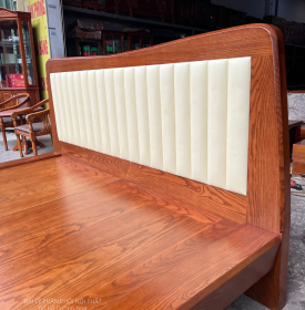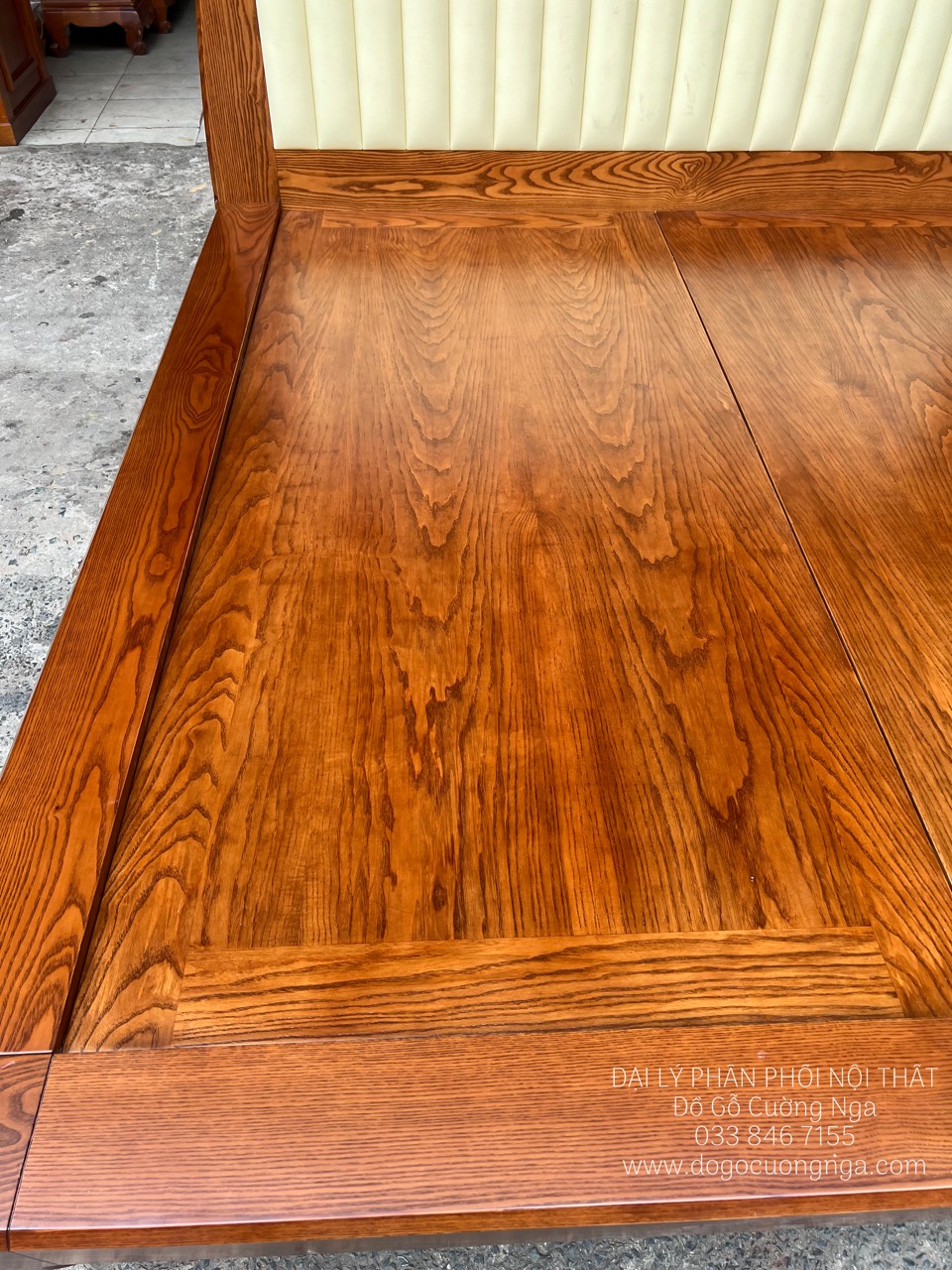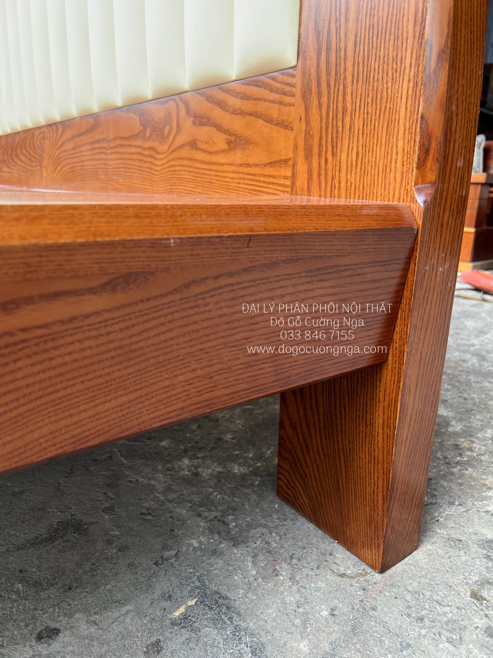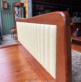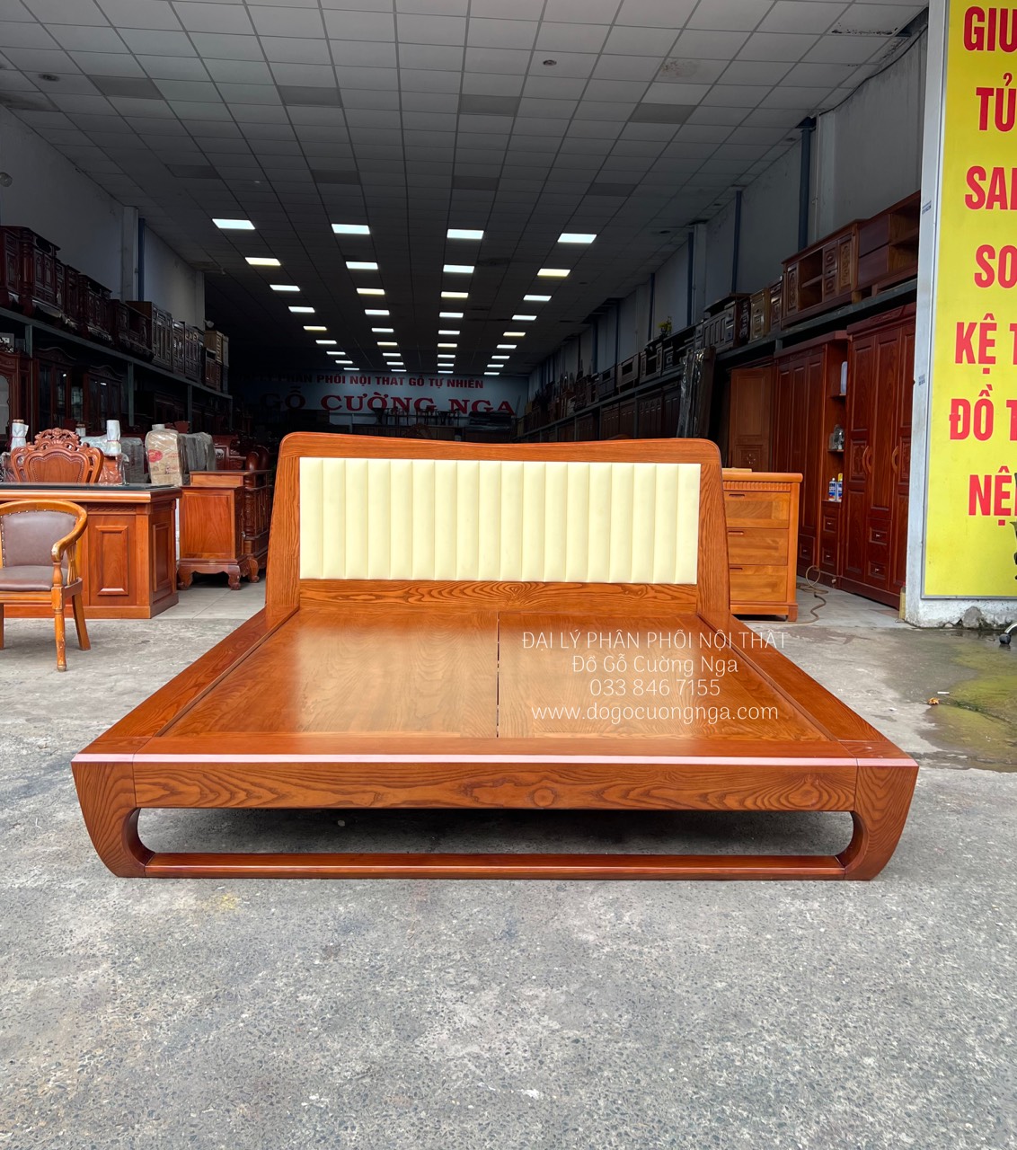 Giường gỗ lấy cảm hứng từ những đường cong mềm mại, cho ra một tác phẩm tuyệt vời. Phần chân giường người thợ mộc sử dụng kỹ thuật vanh gỗ, tạo ra dáng chân quỳ cách điệu tinh tế. Phía đầu giường là sự kết hợp hài hoà giữa chất gỗ và chất liệu da cao cấp. Đầu giường bọc da giúp cho chiếc giường ngủ trở nên sang trọng, mang đến cho người dùng cảm giác mềm mại trong suốt quá trình sử dụng.