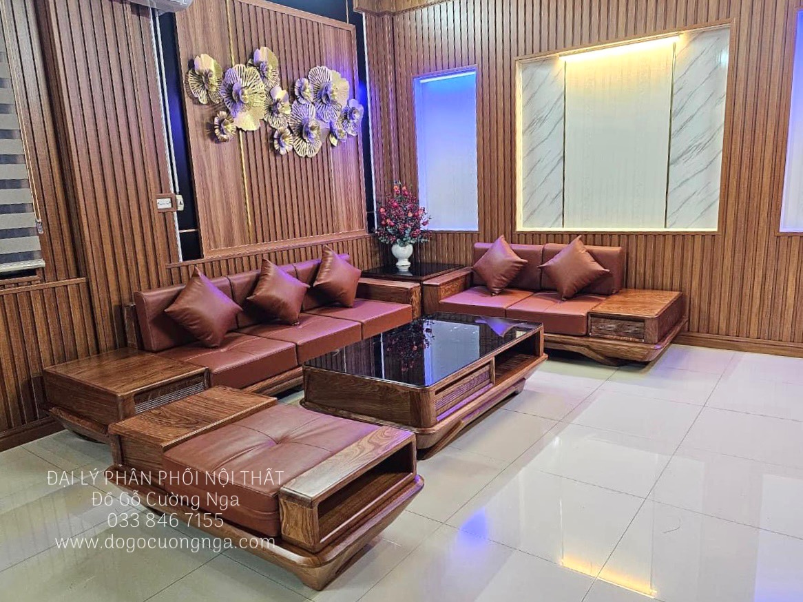Bộ Sofa Gỗ Sồi Nga Góc L Chân Thuyền 2m8x1m9 Màu Óc Chó Sang Trọng