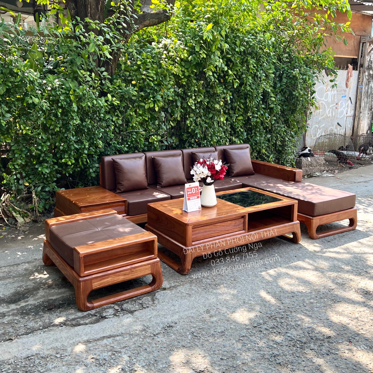Bộ Sofa Gỗ Sồi Nga Góc L Chân Thuyền 2m8x1m9 Màu Óc Chó Sang Trọng