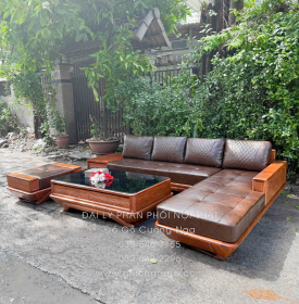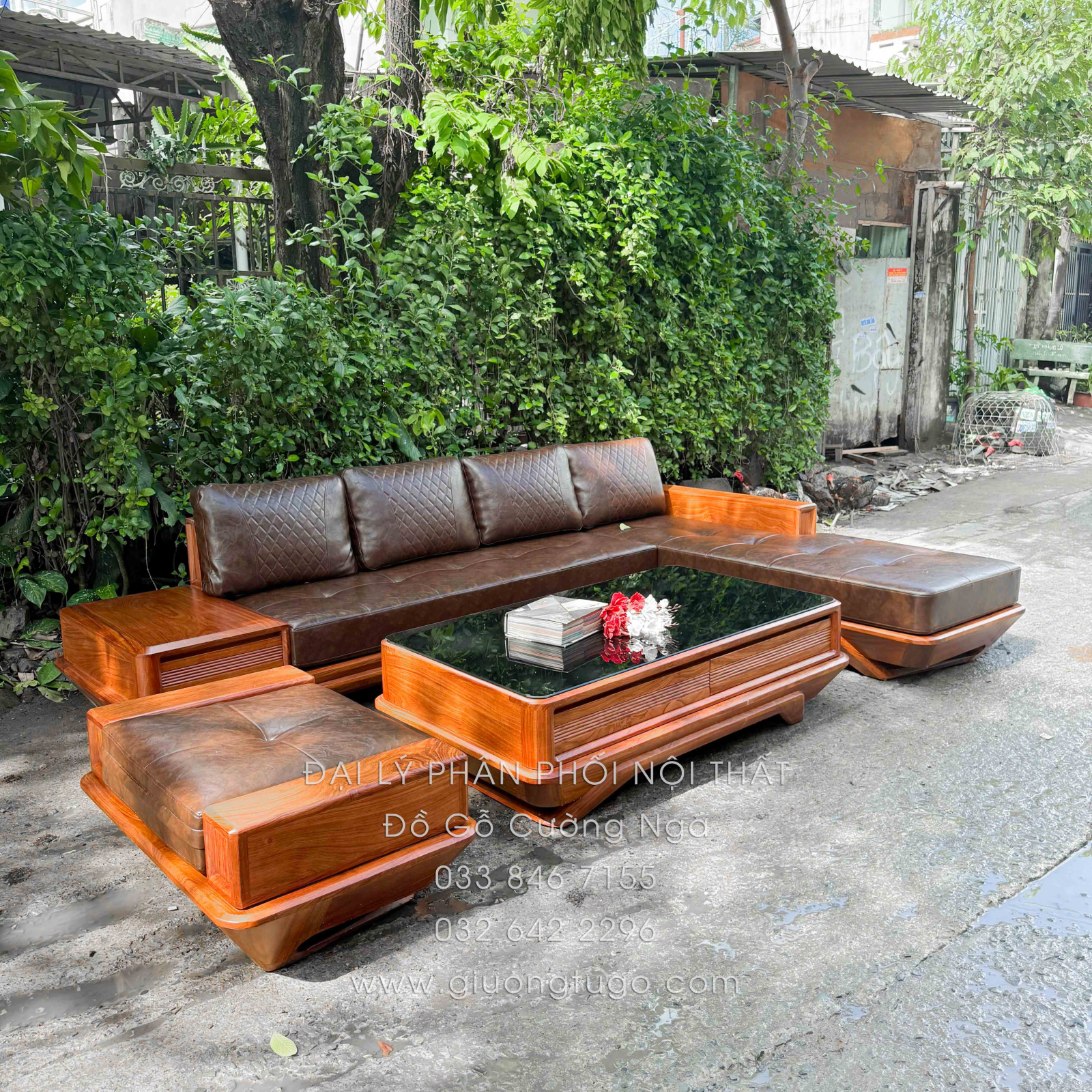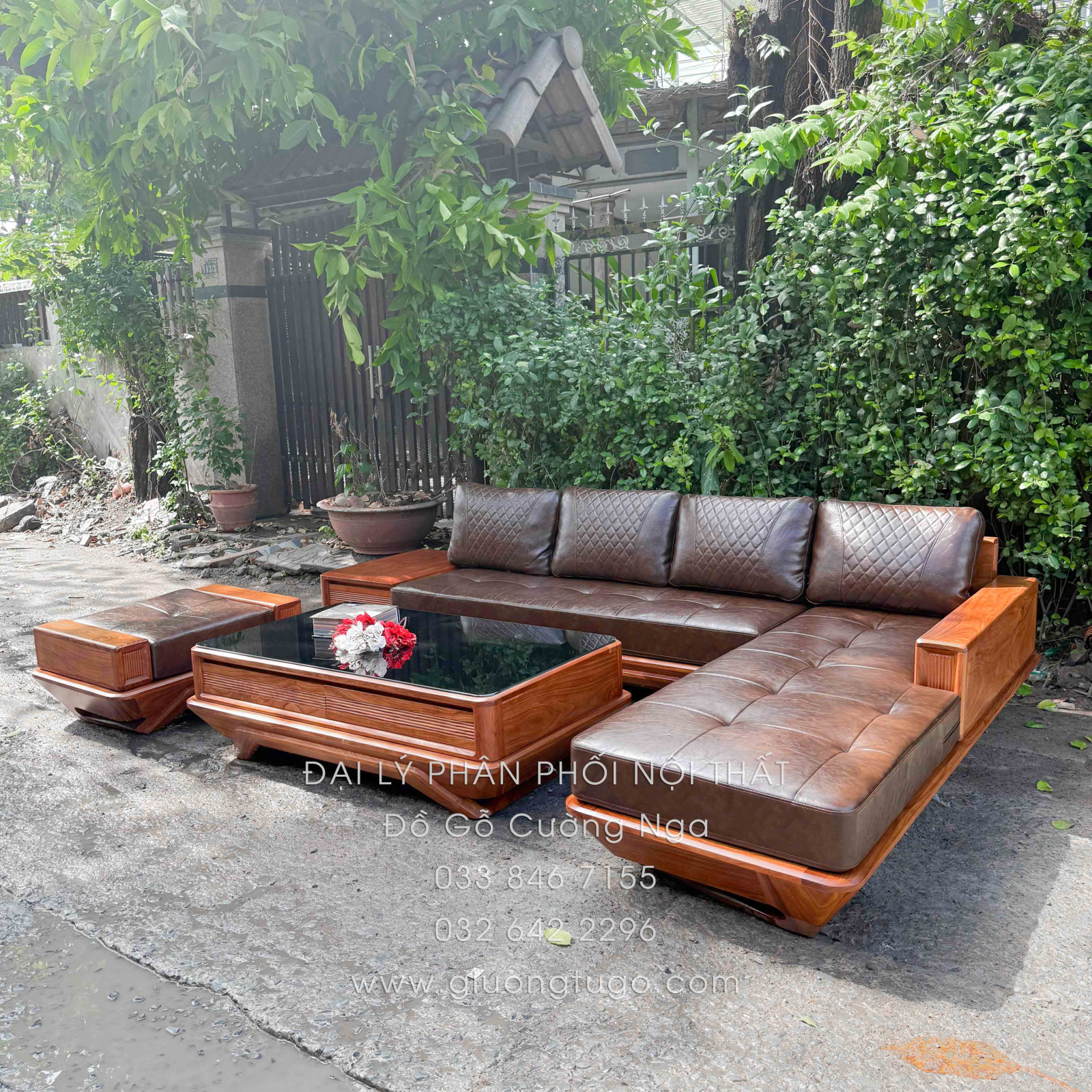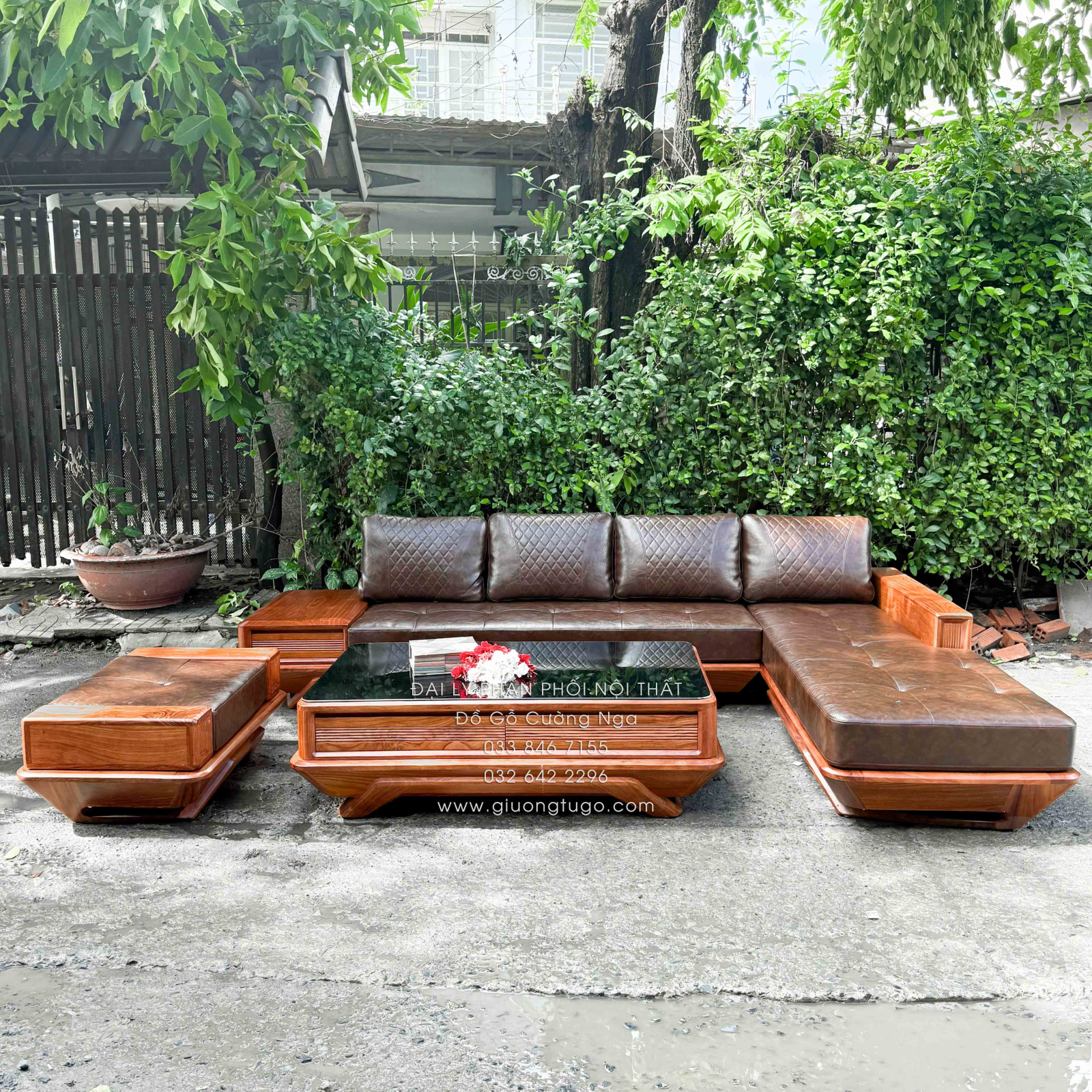 Bộ Sofa Gỗ Sồi Nga Góc L Chân Thuyền 2m8x1m9 Màu Óc Chó Sang Trọng