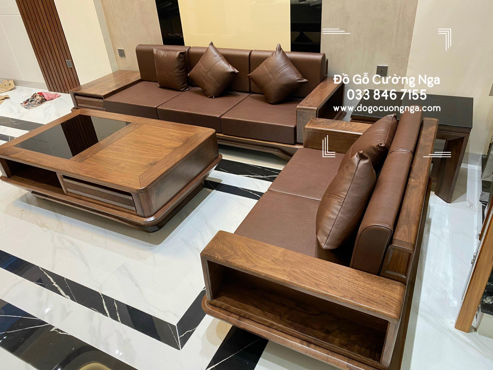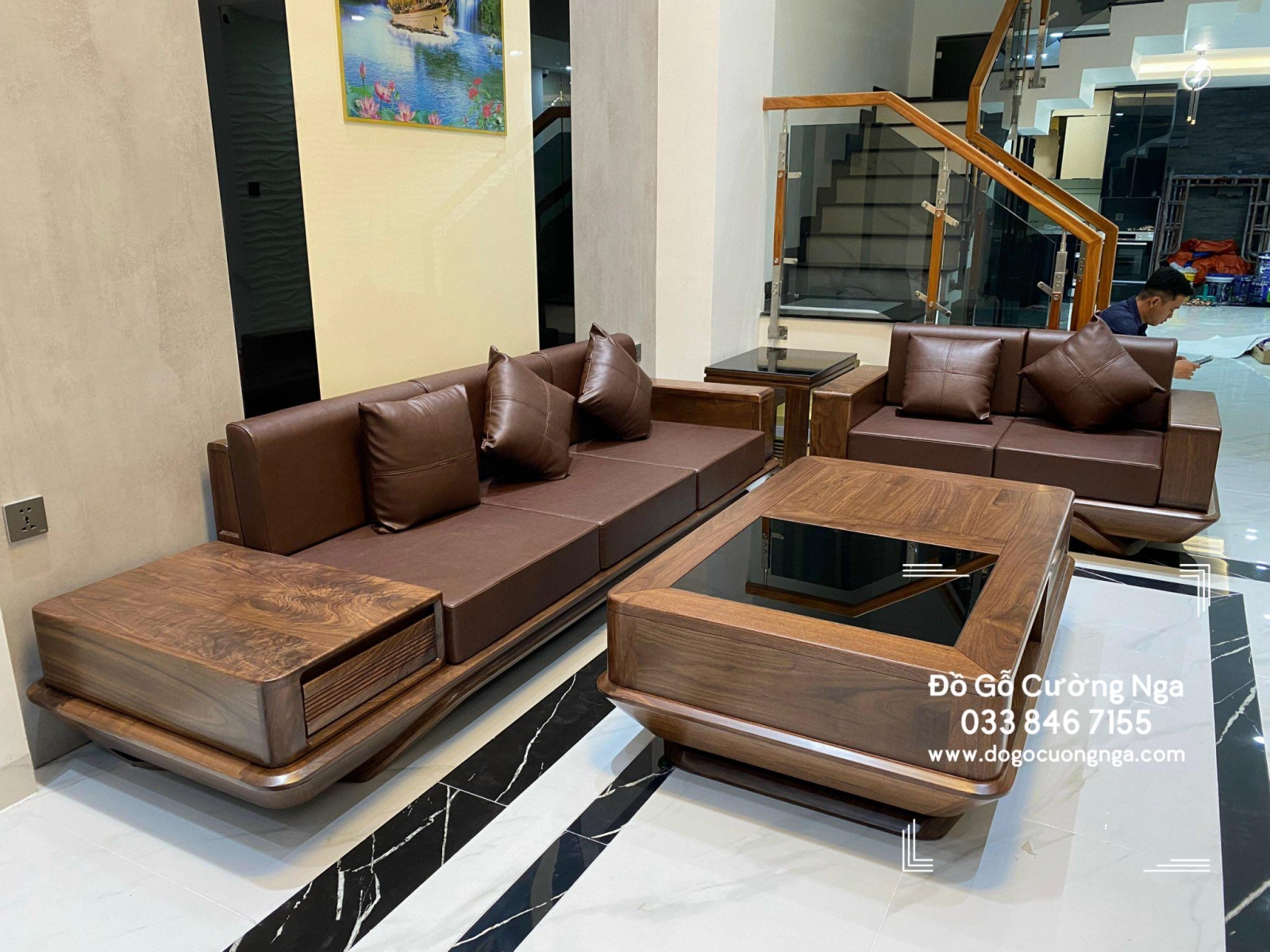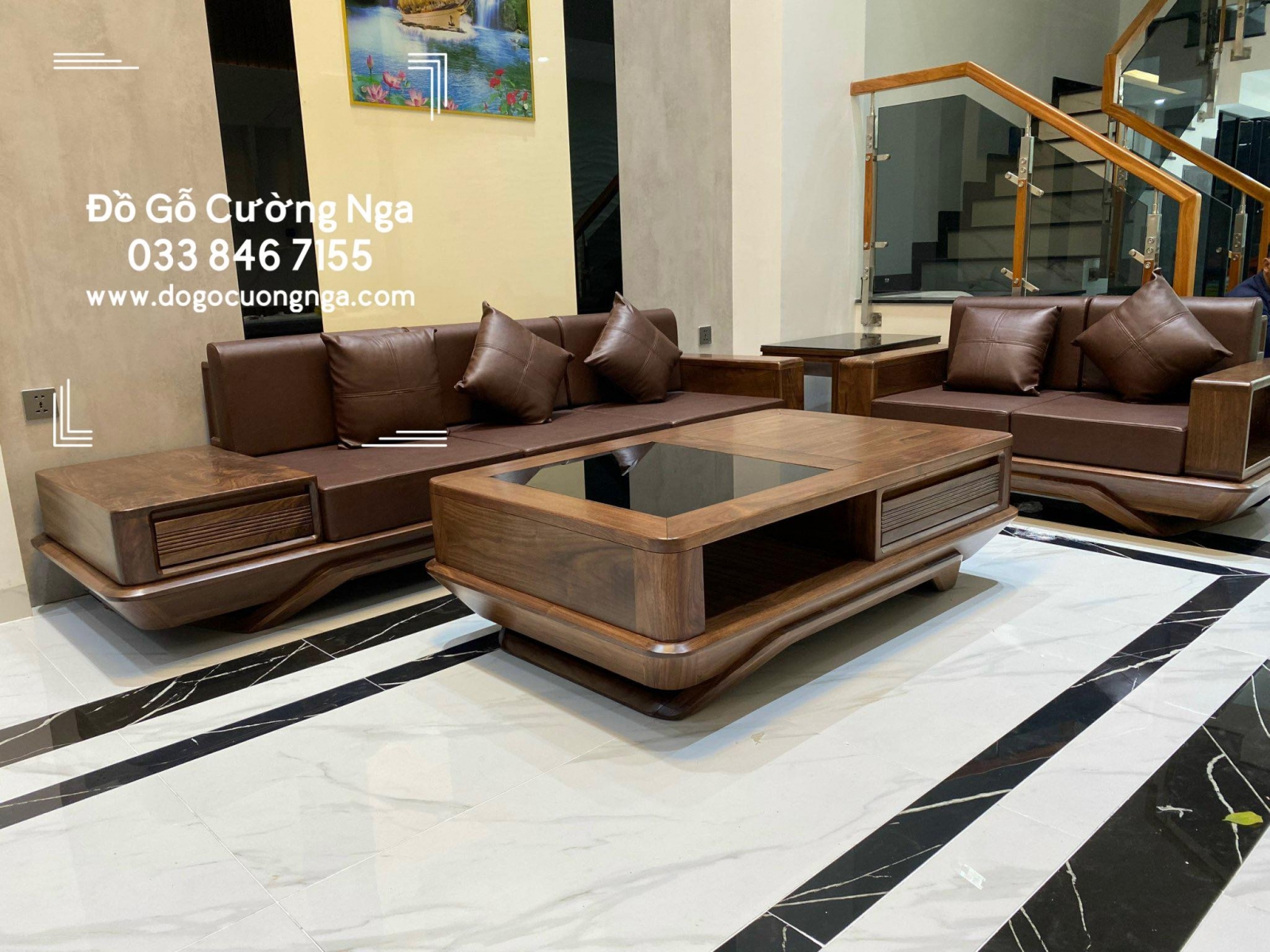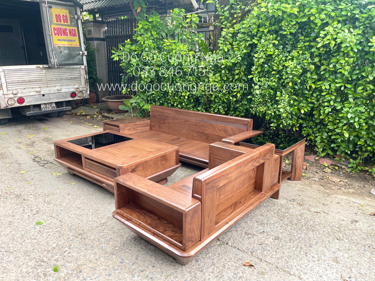 Sofa gỗ óc chó chữ U thiết kế kiểu sofa chữ U thẩm mỹ. Bộ bàn ghế gỗ phòng khách chữ U gồm 2 văng lớn, kết hợp cùng bàn trà kính hiện đại.