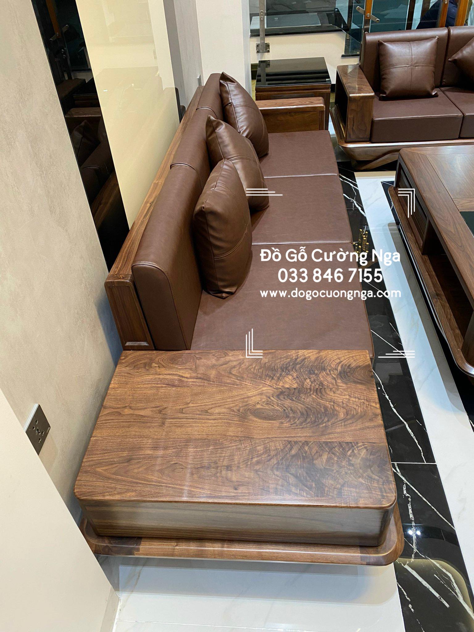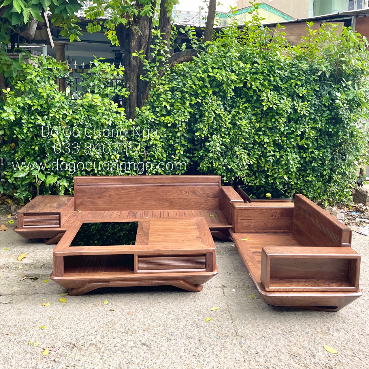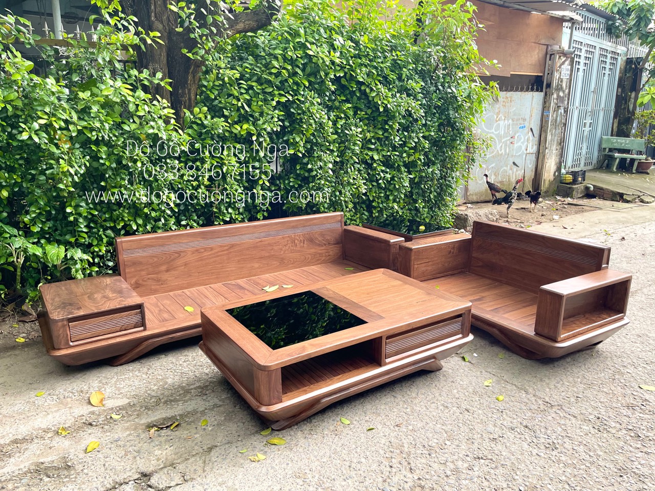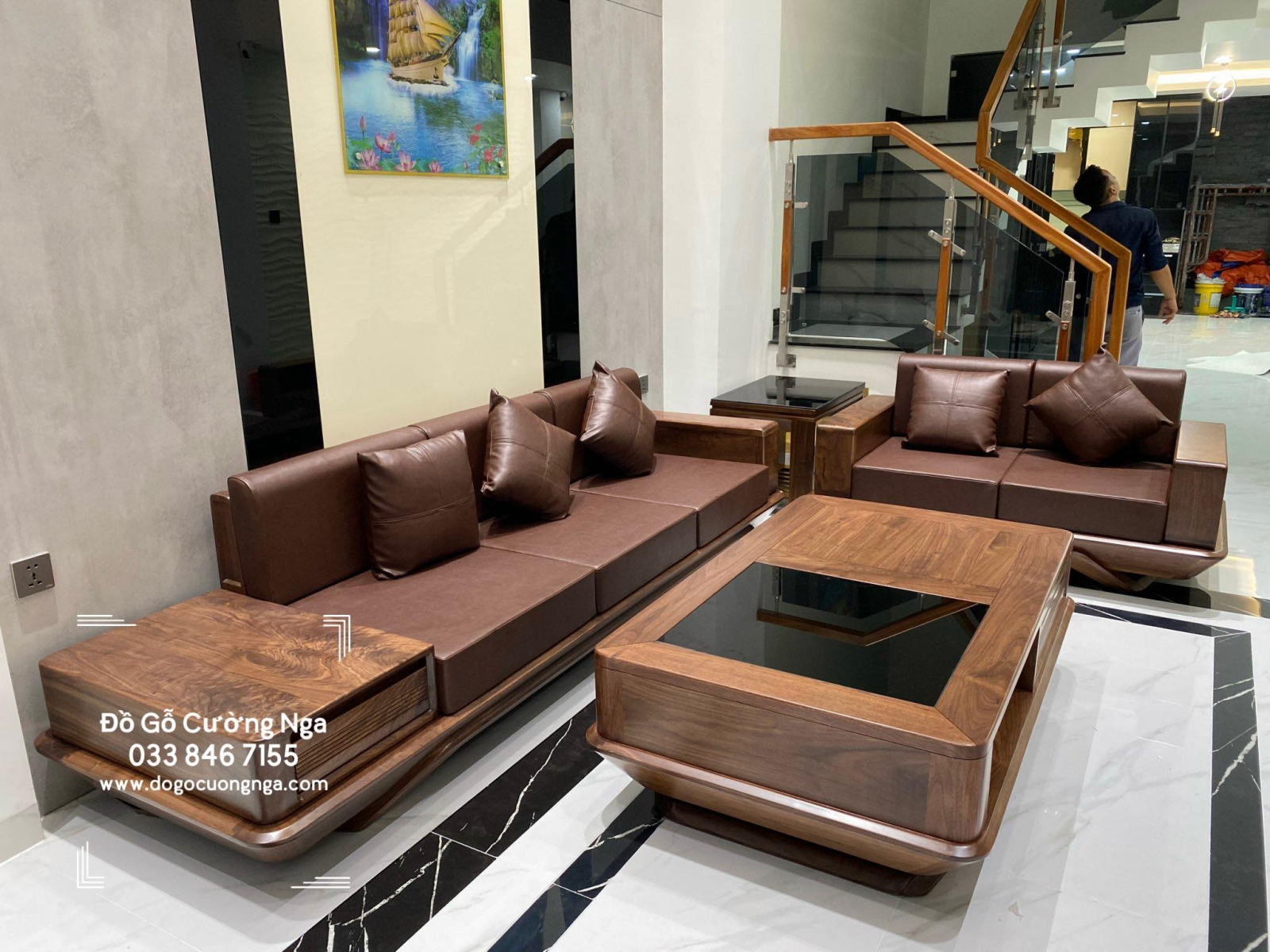 Sofa gỗ óc chó chữ U thiết kế kiểu sofa chữ U thẩm mỹ. Bộ bàn ghế gỗ phòng khách chữ U gồm 2 văng lớn, kết hợp cùng bàn trà kính hiện đại.