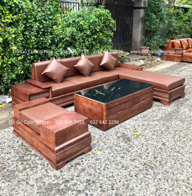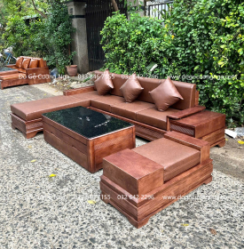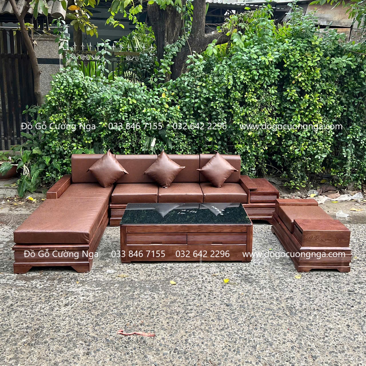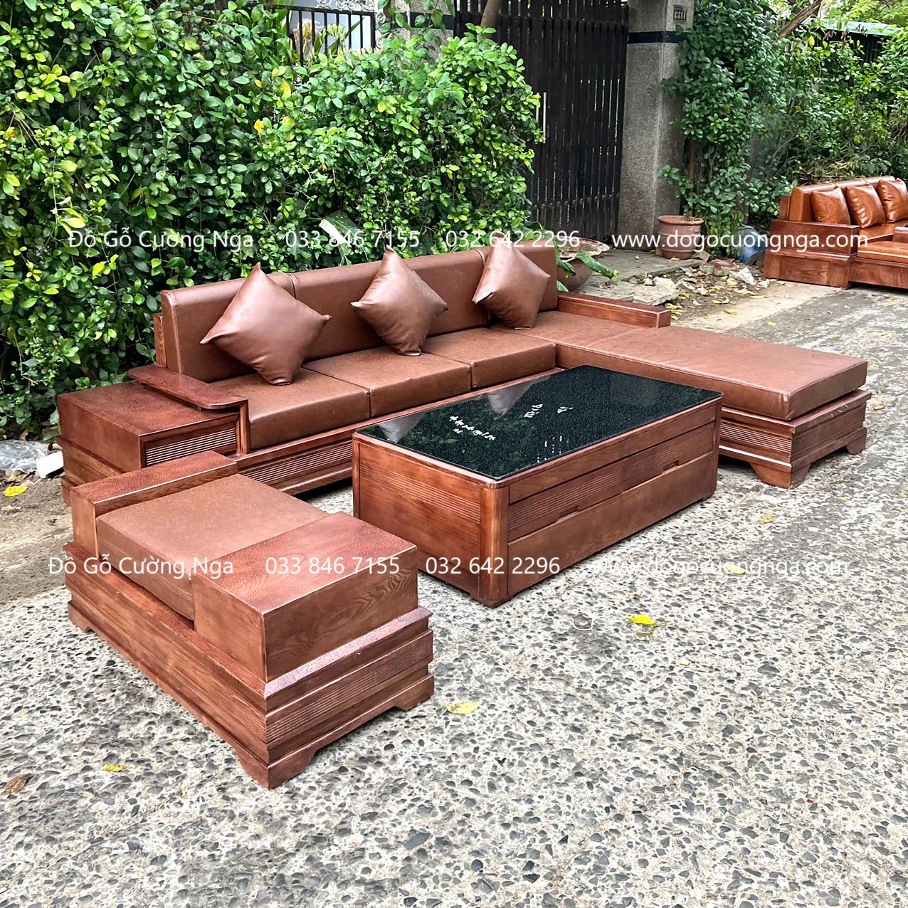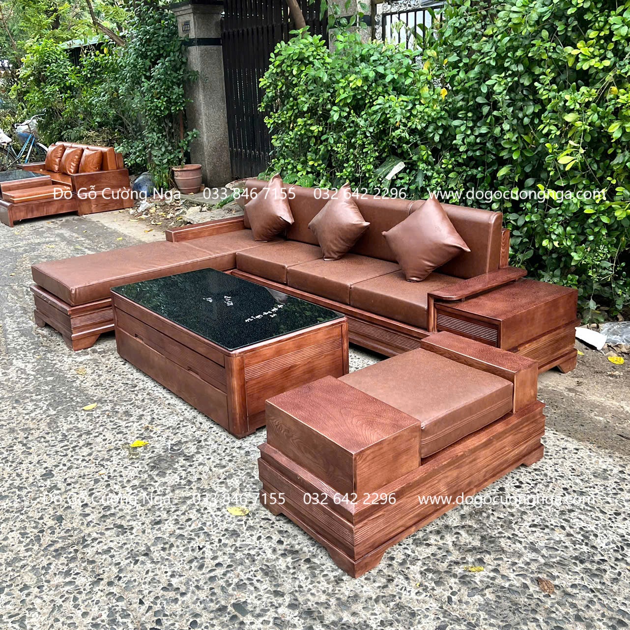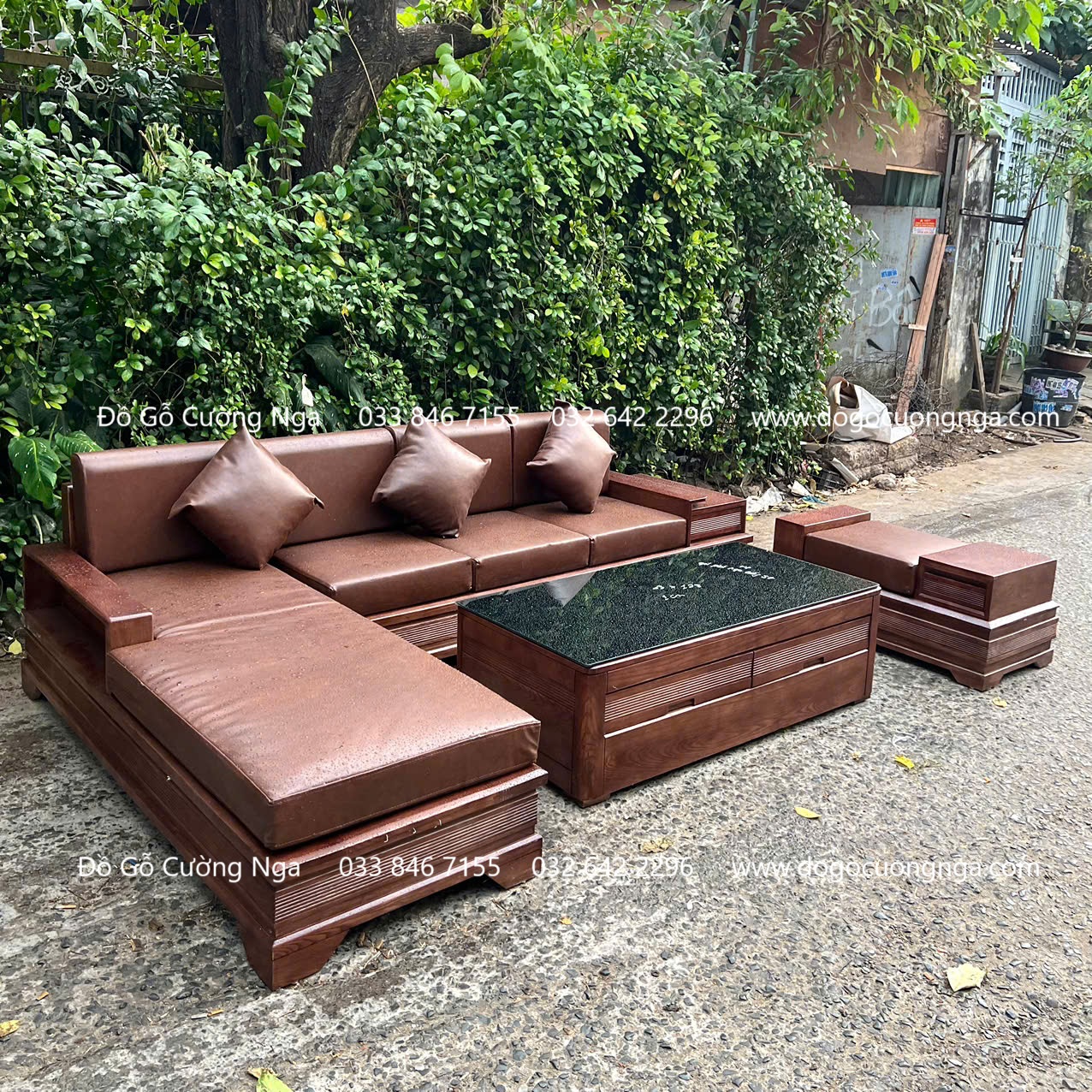 Sofa Gỗ Sồi Nga Lau Màu Óc Chó Góc L Chân Pháo 2m8x1m8 Đẹp Mắt