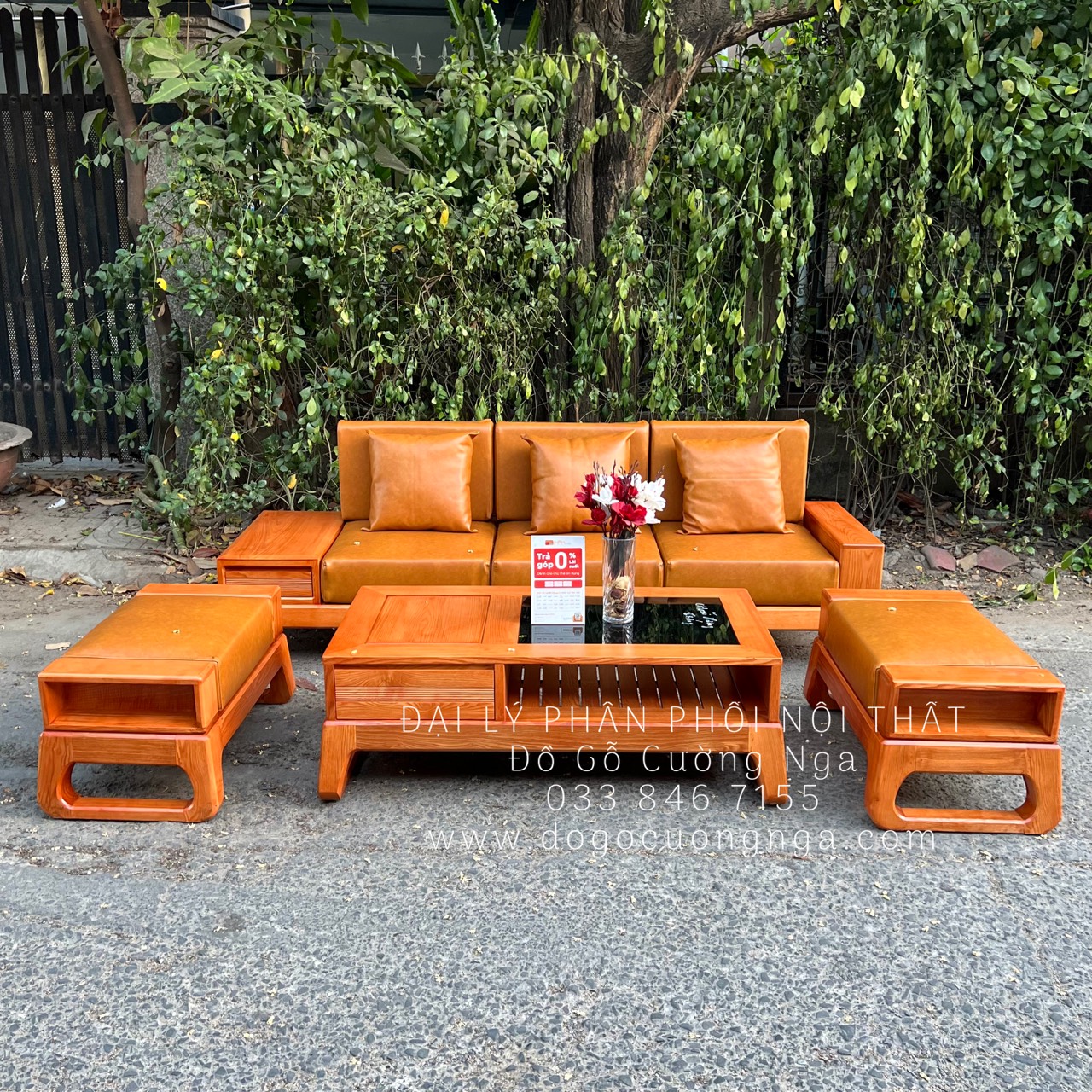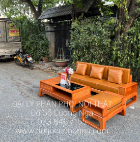Sofa Gỗ Sồi Nga Nhỏ Gọn 1 Văng 4 Chi Tiết Lau Màu Gõ Hiện Đại