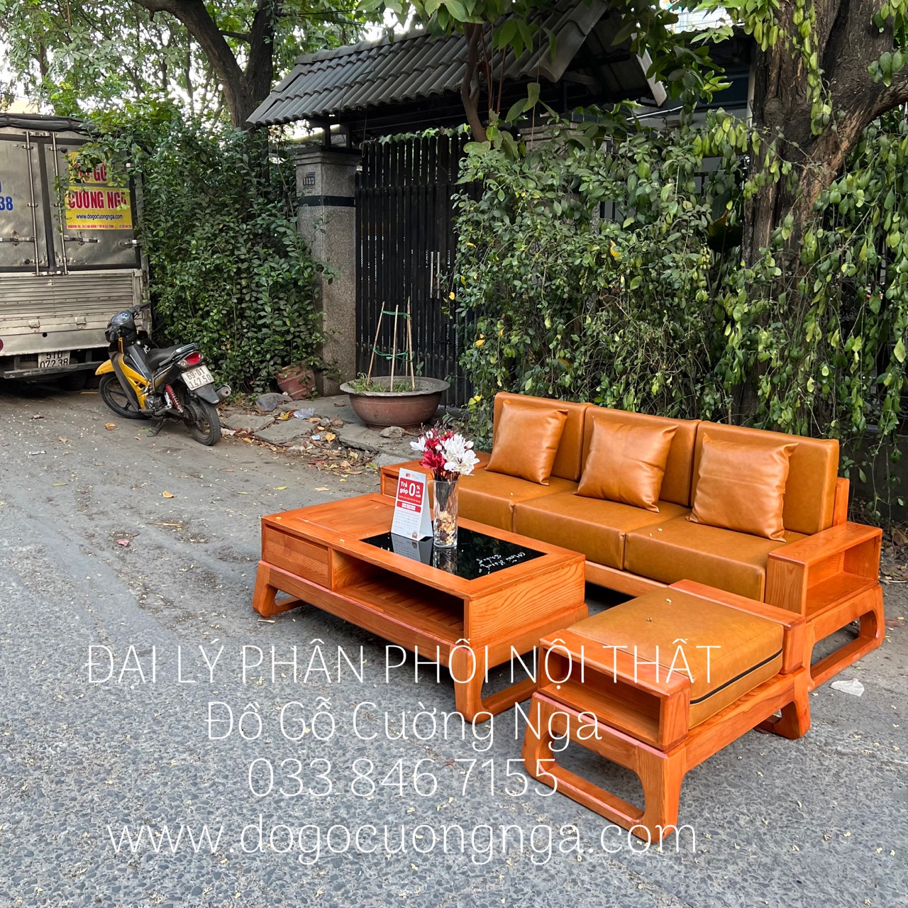 Bộ Sofa Gỗ Sồi Nga Góc L Chân Thuyền 2m8x1m9 Màu Óc Chó Sang Trọng