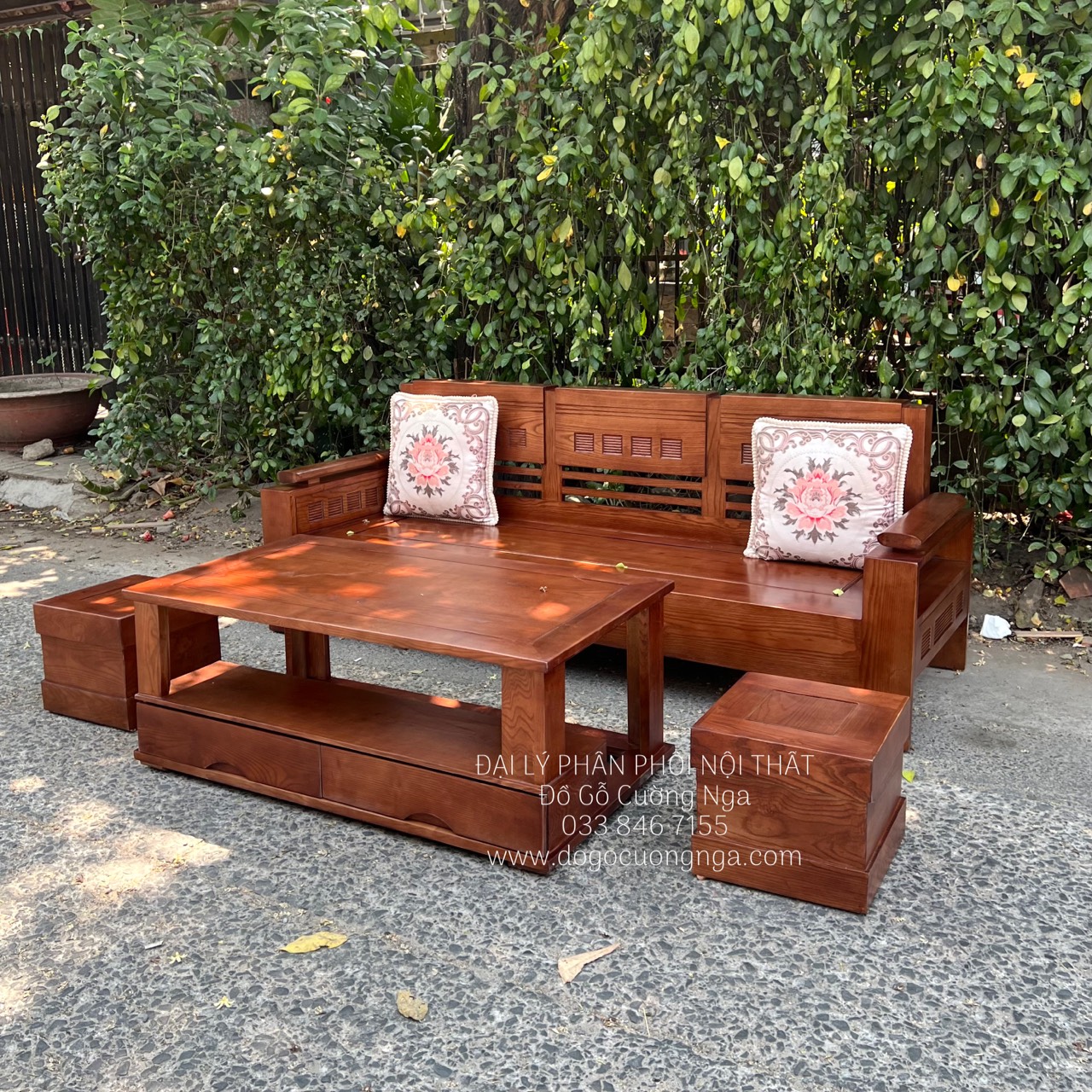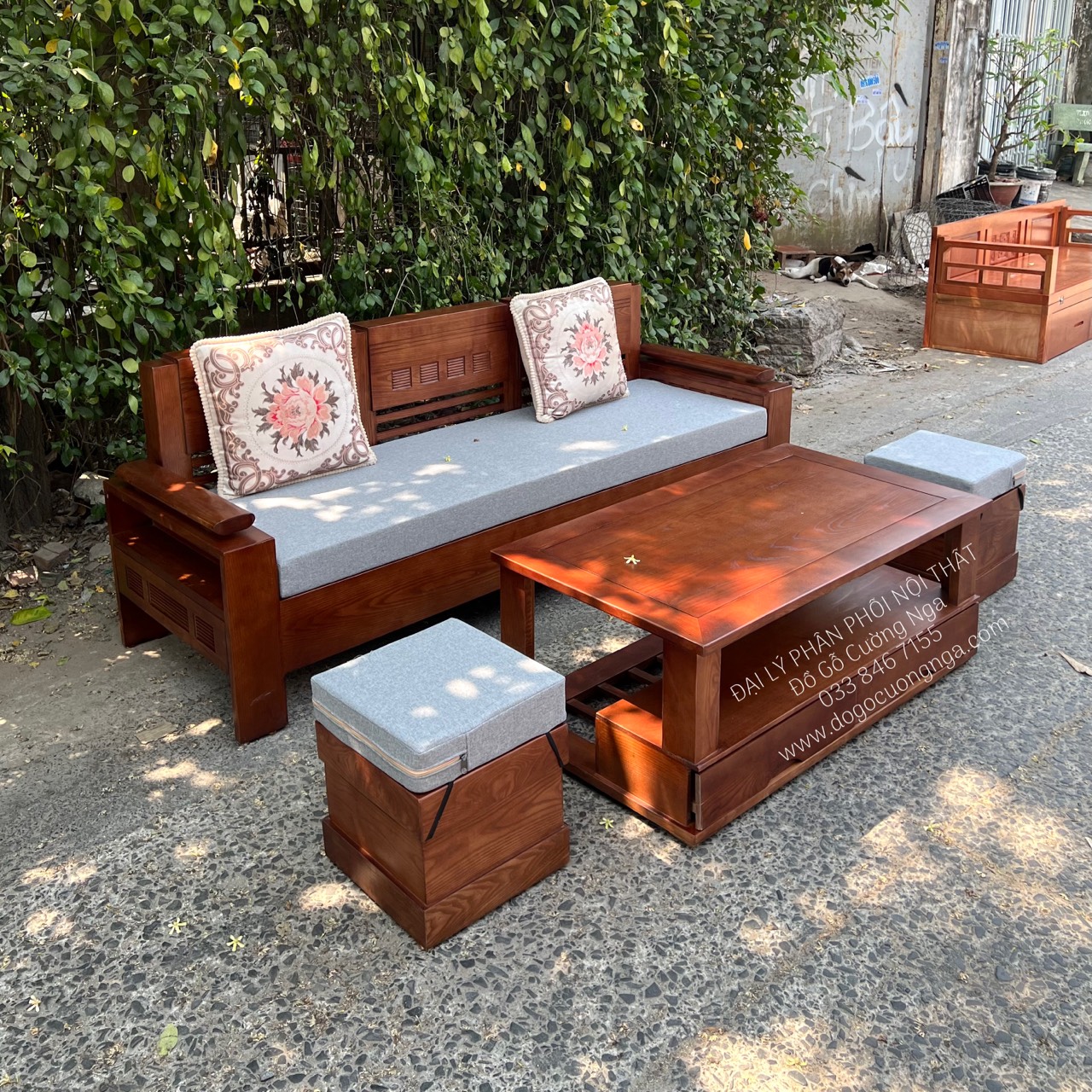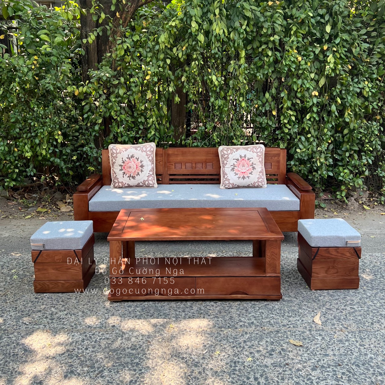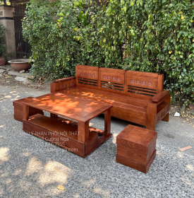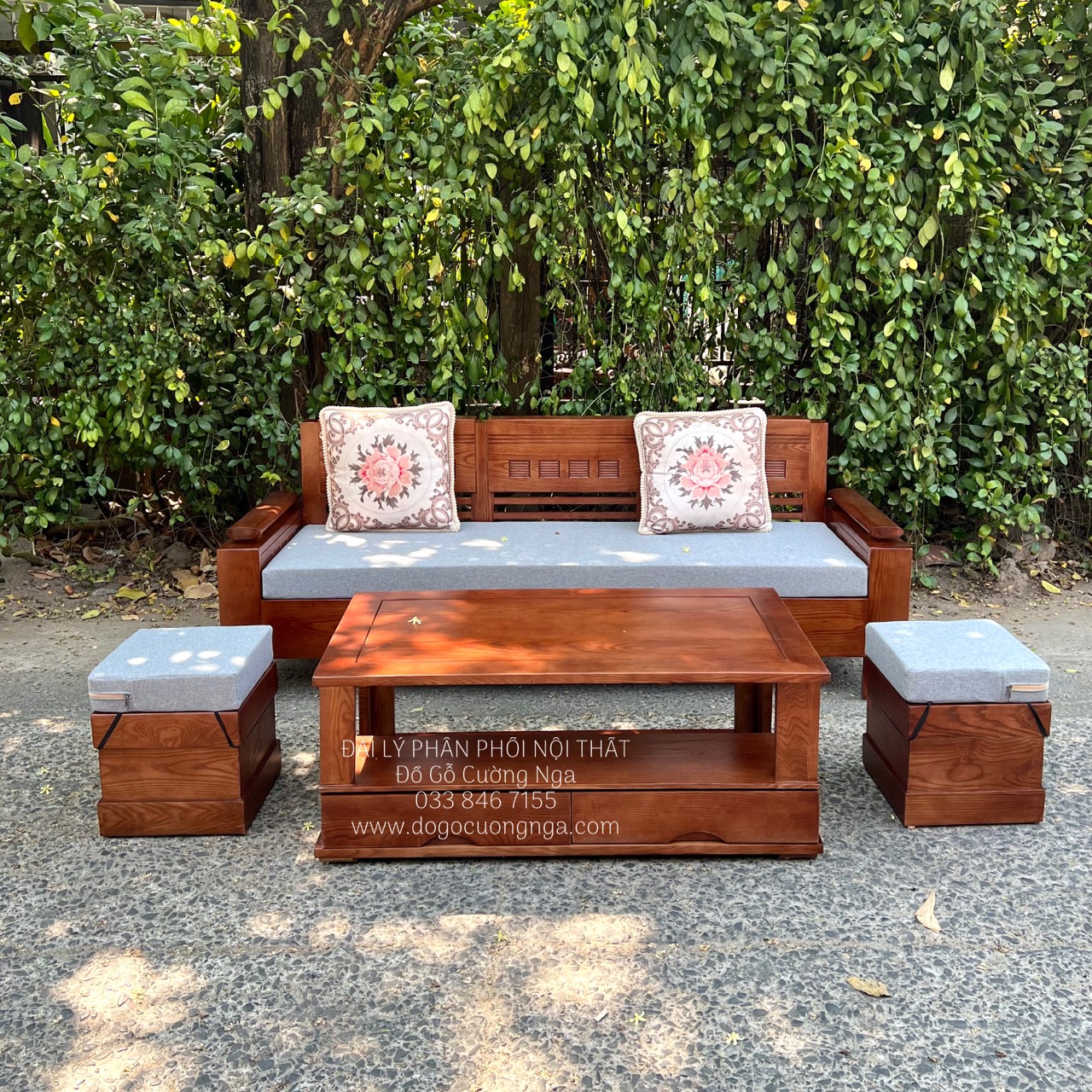 Mẫu sofa có thiết kế 3 chỗ ngồi đơn giản kèm bàn và đôn ngồi và điểm nhấn nổi bật là phần tay ghế có hộc đề đồ tiện lợi, kèm theo đó màu sofa gỗ được sơn màu óc chó mang đến sự sang trọng cho phòng khách gia đình.