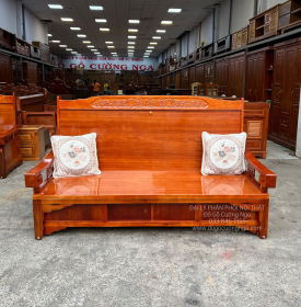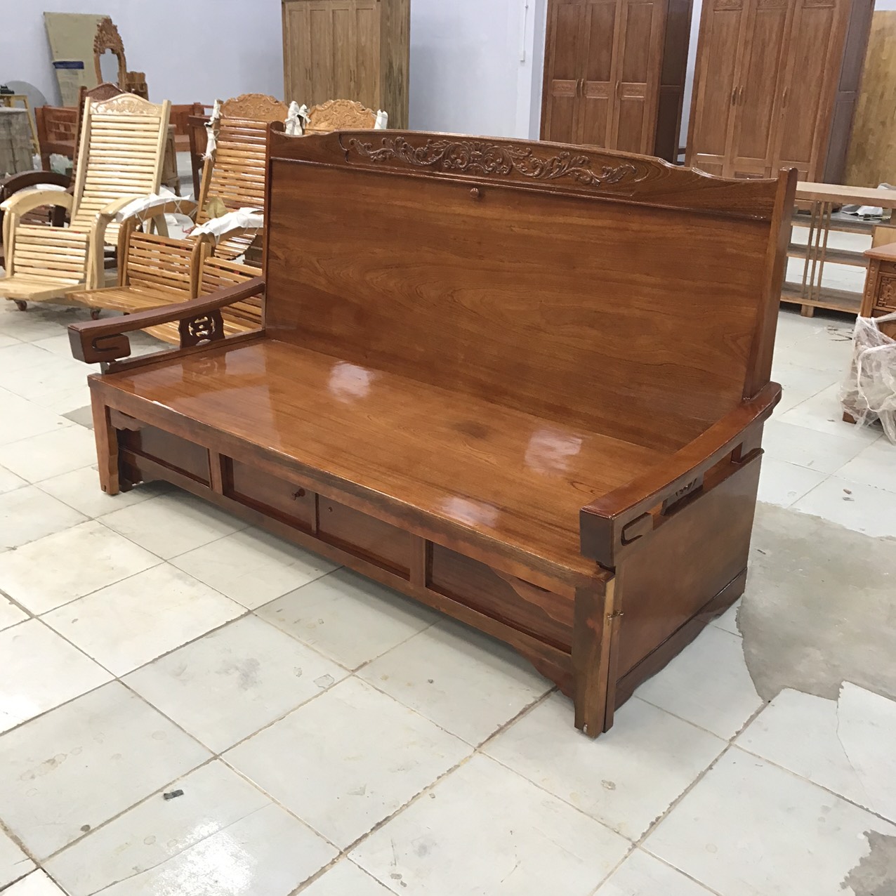 Trường kỷ được làm từ gỗ Xoan Đào. Mẫu ghế có thể ngồi để xem tivi hoặc tiếp khách, thiết kế có thể kéo ra thành giường để nằm nghỉ ngơi rất tiện dụng.