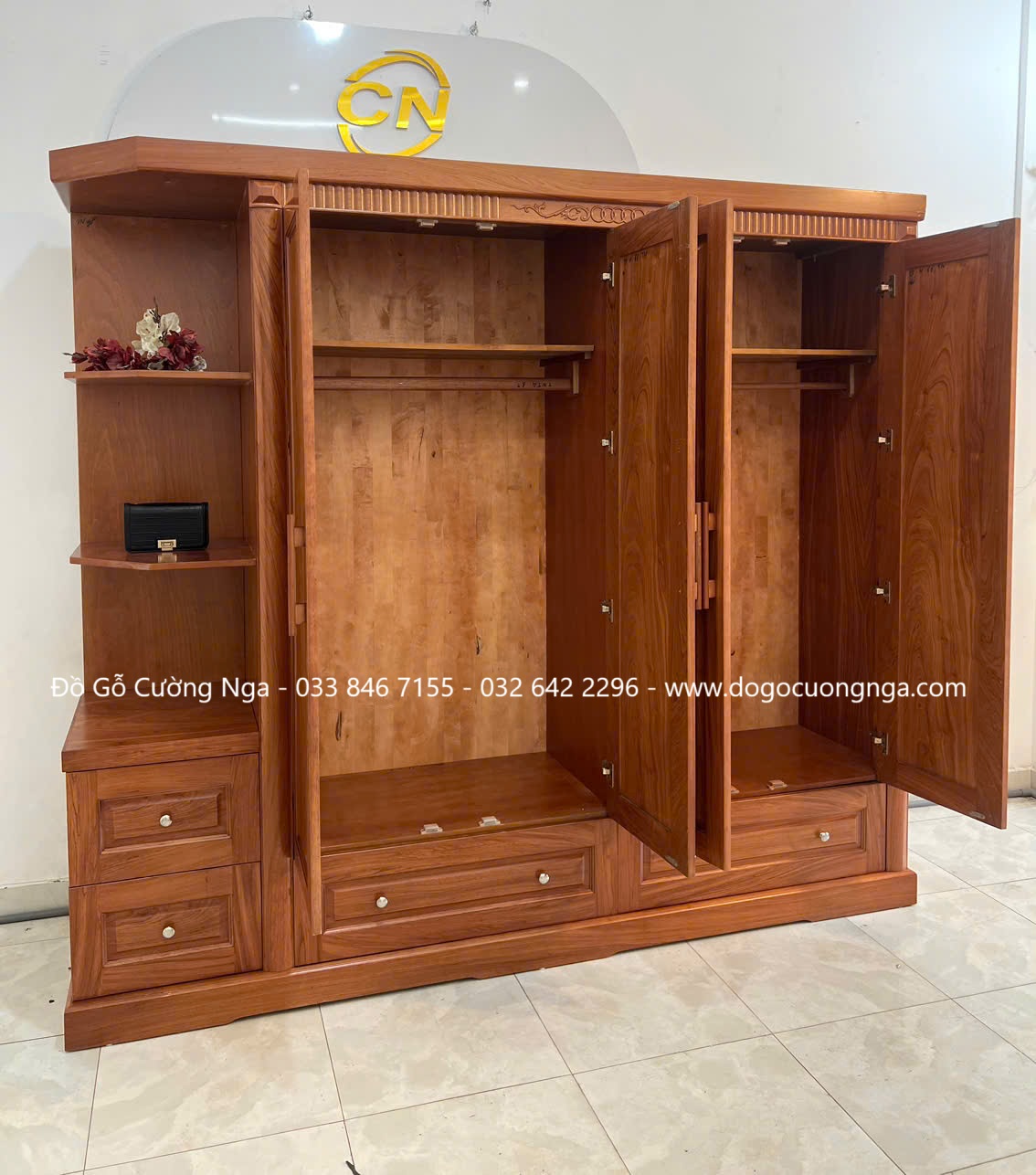 Tủ Quần Áo Gỗ Hương Đá 4 Cánh Kèm Kệ Tiện Nghi